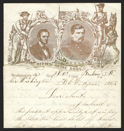 original contents which is the matching letterhead in bronze, w#65, 3c Rose, single tied by Washington, D.C. c.d.s. on 1862 Magnus hand-colored Lincoln, McClellan "Review of the Army" on reverse patriotic cover to Lima, Pa., includes the original contents which is the matching letterhead in bronze, with three-page letter from a soldier to his aunt describing the camp conditions, very fine; a rare patriotic to find postally used, especially with the matching letterhead; 2005 PF certificate. (imagea) (imageb) (Image) Est. $1,500-2,000