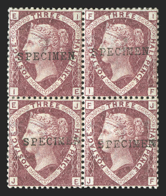 G6u).S.G. #51s, 1870 1½p Rose red, with handstamped "Specimen", block of four, deeply rich color, crackly o.g. that is never hinged, very fine; a scarce specimen block (S.G. Specialized #G6u). (Image) S.G. Spec. £900+