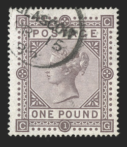 certificate (Scott 75 $4,000.00).S.G. #129, 1878 £1 Brown lilac, premium used example of this scarce high value, deep color and a sharp detailed impression, light Glasgow c.d.s., very fine; 2008 Brandon certificate (Scott #75; $4,000.00). (Image) £4,000