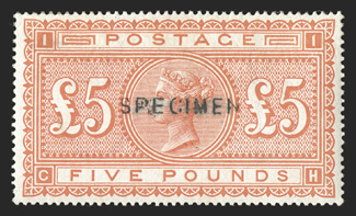 scarce (S.G. Specialized J128t).S.G. #137s, 1882 £5 Orange on white paper, handstamped "Specimen", well centered, lovely bright color, o.g., minor h.r.'s, possible tiny thin speck at top left, very fine and scarce (S.G. Specialized #J128t). (Image) S.G. Spec. £3,800