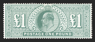 gum that has never been hinged, very fine never hinged copies of tS.G. #266, 1902 £1 Dull blue green, De La Rue, an incredibly fresh mint example, not only being well centered and marvelously fresh, but it also possesses full clean original gum that has never been hinged, very fine; never hinged copies of this high value are few and far between; signed Buhler and accompanied by a 2005 Dr. Knopke certificate (Scott #142; $2,800.00). (Image) S.G. Spec. £3,250