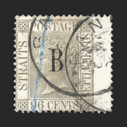 corner crease at top left, otherwise a fine example of this rare stampS.G. #11, 1882 96c Grey with "B" overprint, right wing-margin single, cancelled by c.d.s. postmarks and a light blue crayon mark which is often the case on this stamp, small corner crease at top left, otherwise a fine example of this rare stamp; signed Their and accompanied by a 2010 BPA certificate (Scott #10; $4,000.00). (Image) £3,000