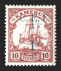 brilliantly fresh, o.g., never hinged, very fine (Scott 55b foS.G. #B3b, 1915 "C.E.F/1d." surcharge on 10pf Red, double overprint, position 67, one of the overprints split between stamp, causing "C.E.F." to appear at the bottom, well centered, brilliantly fresh, o.g., never hinged, very fine (Scott #55b; for hinged $375.00). (Image) for hinged £375