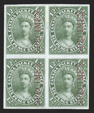 very fine.Unitrade #18Pi, 1859 12½c Yellow green, plate proof on India with red "Specimen.", block of four, large margins, strong fresh color, top left stamp with faint hint of a crease, very fine. (Image) C$1,100.00+