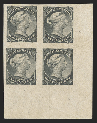 the bottom two stamps are never hinged, extremely fine an impressive#34a, 1882 ½c Black, imperforate, bottom right corner margin block of four, strong color and impression, o.g., lightly hinged on the top stamps and in the bottom sheet margin, the bottom two stamps are never hinged, extremely fine; an impressive margin block; 1996 Greene Foundation certificate (Unitrade C$2,400.00+). (Image) $1,500.00+