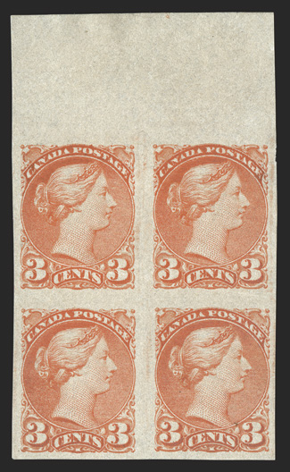 extremely fine (Unitrade C$1,200.00+).#41b, 1891 3c Orange, imperforate, without gum, top sheet-margin block of four, other margins large and even, bright color, faint crease affects the top two stamps, otherwise extremely fine (Unitrade C$1,200.00+). (Image) $950.00+