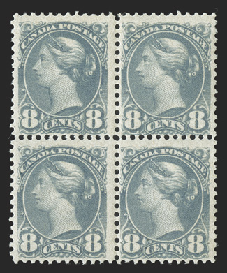 other three stamps never hinged, natural gum wrinkle affects the top sta#59, 1897 20c Jubilee, mint block of four, the top stamps are exceedingly well centered and margined, gorgeous color in an especially deep shade, o.g., top right stamp l.h., other three stamps never hinged, natural gum wrinkle affects the top stamps, fine-very fine (Unitrade C$2,200.00). (Image) $2,150.00