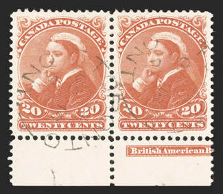 extremely fine a most desirable showpiece (Unitrade C$300.00+).#46, 1893 20c Vermilion, bottom margin pair with partial imprint, exceedingly well centered within uncharacteristically large margins, radiant color, light town cancels, extremely fine; a most desirable showpiece (Unitrade C$300.00+). (Image) $200.00+