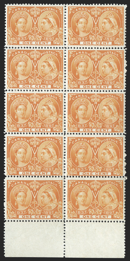 fine (Unitrade C$620.00).#51, 1897 1c Jubilee, bottom margin block of ten, bright color, the top block of four is especially well centered and margined, o.g., n.h., four stamps are fine, six are very fine (Unitrade C$620.00). (Image) $575.00