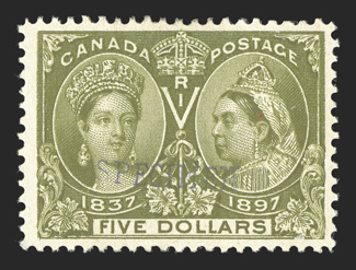 fine-very fine the Unitrade price is for fine original gum.#59S-65S, 1897 20c-$5.00 Jubilee, with handstamped Specimen cplt. set of the seven values that comes with a Specimen overprint, unused, strong colors, $1.00 with light crease, fine-very fine; the Unitrade price is for fine original gum. (Image) Unitrade C$2,600.00