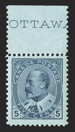 182 nh 91 91, 1903 5c Blue on bluish, top margin partial imprint single, deep intense color, large margins, pristine o.g., n.h., very fine (Unitrade C$900.00).#91, 1903 5c Blue on bluish, top margin partial imprint single, deep intense color, large margins, pristine o.g., n.h., very fine (Unitrade C$900.00). (Image) $550.00