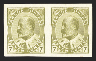 C$1,000.00).#92a, 1903 7c Olive bister, imperforate, without gum as issued, horizontal pair, very large and even margins all around, brilliantly rich color, extremely fine (Unitrade C$1,000.00). (Image) $800.00