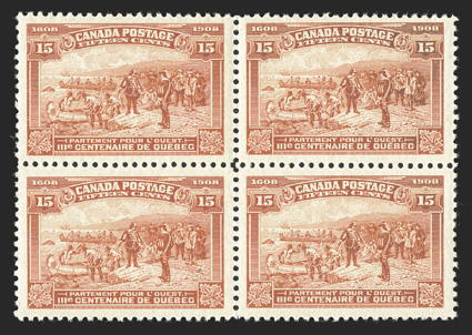 stamp, very fine-extremely fine a wonderfully choice set of blocks (#96-103, 1908 ½c-20c Quebec Tercentenary, cplt. in mint blocks of four, well centered throughout, fresh colors, o.g., most are lightly hinged, 20c with a tiny thin speck on one stamp, very fine-extremely fine; a wonderfully choice set of blocks (Unitrade C$6,320.00+). (imagea) (Image) $3,844.00+