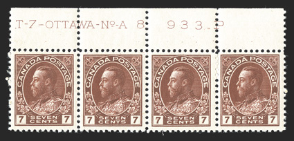 (Unitrade C$540.00).#114b, 1924 7c Red brown, wet printing, top margin imprint and plate No. A8 strip of four, deep vibrant color, well centered, o.g., n.h., very fine; cataloged as four singles (Unitrade C$540.00). (Image) $320.00+