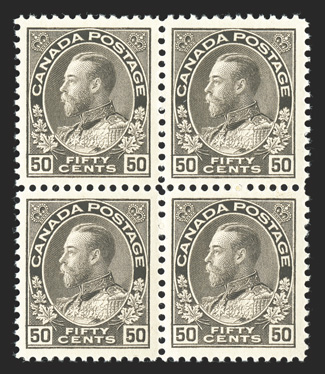 C$1,440.00).#120, 1925 50c Black brown, dry printing, mint block of four, well centered within uncommonly large margins, fresh color, o.g., n.h., very fine-extremely fine (Unitrade C$1,440.00). (Image) $800.00