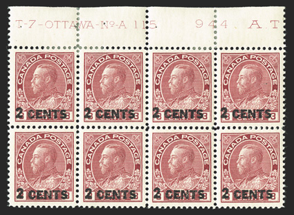 selvage, very fine (Unitrade C$750.00).#139, 1926 "2 cents" surcharge on 3c Carmine, Die I, top margin imprint and plate No. A115 block of eight, exceptionally well centered, strong color, o.g., h.r.'s in the top selvage, very fine (Unitrade C$750.00). (Image) $575.00