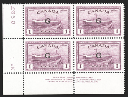C$750.00).#O27, 1951 $1.00 Fisheries, "G" overprint, bottom left corner imprint and plate No. 1 block of four, well centered and fresh, o.g., n.h., very fine (Unitrade C$750.00). (Image) $560.00