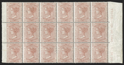 269 og/nhbl 2 2, 1860, 2½p Rose, a most impressive block of eighteen, comprising three complete rows, with wing margins at left and a large part of the imprint at right, rich fresh color,