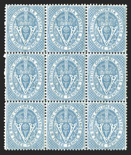 toned spot on reverse of bottom left stamp, a fine multiple (Unitrade#7, 1865 3p Blue, mint block of nine, attractive color, o.g., middle row never hinged, others with h.r., including hinge reinforcing of separated perfs. at bottom left, trivial toned spot on reverse of bottom left stamp, a fine multiple (Unitrade C$1,800.00). (Image) $1,260.00
