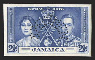 otherwise very fine and very rare also includes an l.h. perforated SpecimeS.G. #118s-120s var., 1937 1d-2½d Coronation imperforate, perforated "Specimen" in arc (Samuel Ty. D20), large margins all around, o.g., n.h., two with mild gum creases, otherwise very fine and very rare; also includes an l.h. perforated "Specimen" set; ex-De La Rue archives (Scott #113-115s var.). (imagea) (Image) Est. $750-1,000