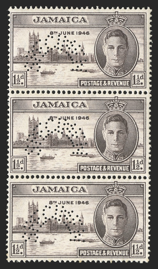 multiples (Scott 136-137s).S.G. #141s-142s, 1946 1½d and 3d Victory, perforated "Specimen" in arc, vertical strips of three, o.g., n.h., bottom 3d with some foxed perfs., otherwise fine-very fine; scarce in multiples (Scott #136-137s). (imagea) (Image) £255