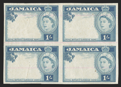 watermarked paper showing misregistration of the Queens Head, theS.G. #160 var., 168 var., 1956 1d Black and emerald imperforate and 1/- Blue with center omitted, printer's waste removed from De La Rue, blocks of four of each, the 1d on gummed watermarked paper showing misregistration of the Queen's Head, the 1/- on ungummed unwatermarked paper with light red horizontal lines, top 1d pair creases and 1/- with light wrinkles, very fine appearance; the only values known as such (Scott #160 var., 168 var.). (imagea) (Image) Est. $300-400