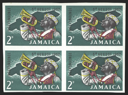 normal stamps both cancelled-to-order by clear KingstonJamaicaAp 12,S.G. #226a, 1964 1/- Black and light brown, light brown omitted, bottom left corner margin vertical strip of five, the bottom two stamps the errors, the top error and bottom normal stamps both cancelled-to-order by clear "Kingston/Jamaica/Ap 12, 65" datestamp, o.g., n.h., some light gum toning, very fine; a rare and visually striking error multiple; cataloged as two mint singles (Scott #226a; $1,600.00). (Image) £4,500