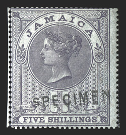 surrounded by hand-drawn pen and ink frames, below which are manuscript1879 3d and 1/- Telegraph stamp essays, manuscript Requisition sheet (202x320mm) upon which are affixed essays for the 3d and 1/- designs, each made with printed head in blue surrounded by hand-drawn pen and ink frames, below which are manuscript specifications for design, size, color and value, along with the note To be put up in square blocks of twenty Shillings in value, as English Postage Stamps are." and dated 3rd March 1879 at the GPO Jamaica, 1/- light stain, otherwise very fine and unique; ex-De La Rue Archives. (Image) Est. $1,000-1,500