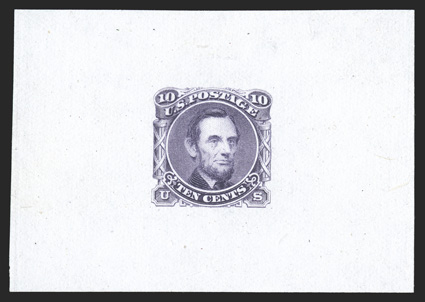 fine.#116-E1d, 10c Lincoln, unadopted design, large die essay in Red violet on India, measuring 67x47mm, without imprint at bottom, tiny insignificant thin speck, very fine. (Image) $1,000.00