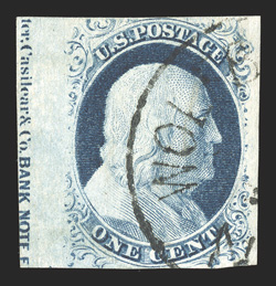 top right, otherwise very fine pictured in Ashbrook (Volume 2, p#9, 1c Blue, Ty. IV, position 27L1L, double transfer, four ample to large margins, deep rich color, cancelled by very rare New York double slug c.d.s., minor diagonal crease at top right, otherwise very fine; pictured in Ashbrook (Volume 2, page 118) and stated by him to be "the only example I have ever seen"; ex-Cowitt. (Image) Est. $300-400
