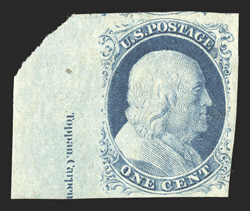 including a partial sheet margin at left and displaying a portion of the#9 var., 1c Blue, Ty. IV, position 91L1L, triple transfer, one inverted, a highly select example of this important position, possessing large to huge margins all around, including a partial sheet margin at left and displaying a portion of the adjoining stamp at top, allowing the plate guide dot to show in the top left corner, deep rich color and a strong impression, extremely fine; a marvelous example of this collectible variety, with the lines from the original transfer showing clearly in the sheet margin; ex-Cowitt. (Image) $400.00