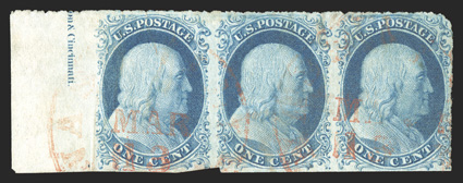 a lovely strip that is exceptionally well margined, including a#9, 7, 9, 1c Blue, Ty. IV, Ty. II and Ty. IV combination horizontal strip of three, positions 3-5R1L, position 4R1L being the sole position on Plate One Early that was not recut, a lovely strip that is exceptionally well margined, including a partial sheet margin at top, other margins large as well, bright color and an outstanding impression showing the types exceptionally well, each stamp with neat diagonal pen stroke cancels, left stamp with minor bend/crease mostly in the sheet margin, overall extremely fine and desirable; ex-Cowitt. (Image) Est. $400-500