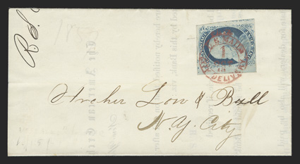 neat printed circular dated October 14, 1857 by superb strike of#9, 1c Blue, Ty. IV, position 31L1L, double transfer, handsome single with three huge margins, fourth at bottom just touching, exceptional color and impression, tied to small neat printed circular dated October 14, 1857 by superb strike of red "U.S. Mail/1/City Delivery/Oct 15" carrier cancel, this cancel rarely seen so clear, very fine; a particularly eye-appealing cover; ex-Cowitt. (Image) Est. $300-400