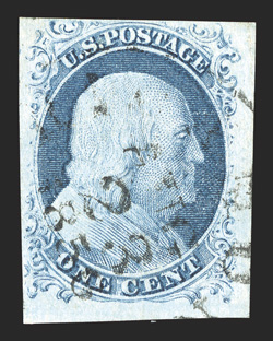 a red New York c.d.s. and a British pacquet boat c.d.s., extreme#9, 1c Blue, Ty. IV, position 77R1L, gorgeous used single, featuring four large to extra-large margins, deep rich color and impression, beautifully cancelled by portions of both a red New York c.d.s. and a British pacquet boat c.d.s., extremely fine; an eye-appealing gem; ex-Cowitt. (Image) $150.00