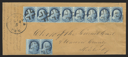 position 4 being Ty. II, the only position on the plate of 200 that wa#7, 9, 1c Blue, Ty. II, Ty. IV, positions 1-10R1L, an amazing franking of a horizontal pair and a strip of eight, comprising the entire top row of plate 1 late - right pane, position 4 being Ty. II, the only position on the plate of 200 that was not recut, nine of the stamps display double transfers, the stamps are quite well margined considering how difficult it would have been to cut the strip, some stamps with margins just touching or slightly cutting the design, strong rich color and impressions, all tied by most unusual individual "crossroad" postmarks and by matching "Goliad, Tex./Apr 5" c.d.s., to large portion of a courthouse cover which has been refolded at the edges to give it a better overall facial appearance, it has been suggested that the 10c in postage represented a "book rate", regardless this is an extraordinary franking utilizing one of the most important complete rows from plate 1 late. (Image) Est. $3,000-4,000