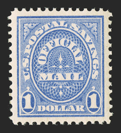 exceedingly large margins, brilliantly fresh color and immaculate o.g. th#O123, $1.00 Postal Savings, a sensational mint single that has no equal, as this gem features all the desirable characteristics one could hope for - perfect centering amid exceedingly large margins, brilliantly fresh color and immaculate o.g. that has never been hinged, a superb stamp in the finest condition possible; 1990 PF certificate, as well as 2008 and encapsulated PSE certificates (Gem 100 Jumbo; SMQ does not price higher than 95 - at $2,000.00 - which is irrelevant on a stamp of this caliber); the only example of the official postal saving stamps to receive the supreme Gem 100 Jumbo grade. (Image) $450.00