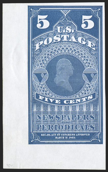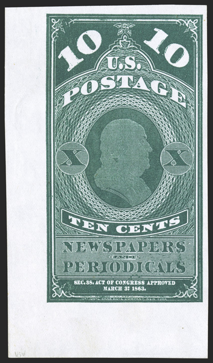 wonderfully well margined all around, in addition to being bright and fres#PR5 var.-PR7 var., 5c-25c 1875 Continental special printings of the 1865 Newspapers, imperforate, a marvelous matched set of bottom left corner sheet-margin singles, each wonderfully well margined all around, in addition to being bright and fresh, intense colors, extremely fine; a handsome and rare set; it is thought that only two sheets of each value were printed (one complete set of sheets we believe still remains intact), leaving only ten possible sets of singles available to collectors; each lightly signed as Special Printings by E. Costales. (imagea) (imageb) (Image) Est. $3,000-4,000
