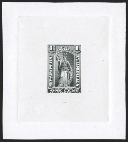 imprint below design, wonderfully fresh and clean, extremely fine an in#PR81-E1a, 1c Black large die essay on India, die sunk on card measuring 88x99mm, being a complete engraving of the entire design as adopted for the 12c to 96c values, "S-A" imprint below design, wonderfully fresh and clean, extremely fine; an incredibly handsome and rare essay. (Image) $1,000.00