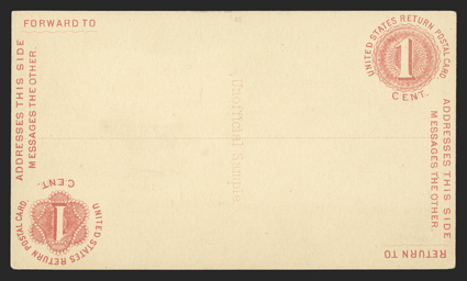 unusual, very fine also accompanied by the paid reply postal caUndersander #E801, 3c Red on white Marshall patented return stamped envelope essay, with preprinted return address, showing inverted second reply impression of the indicia, most unusual, very fine; also accompanied by the paid reply postal card version which is also unusual and scarce, very fine pair. (imagea) (Image) Est. $150-200