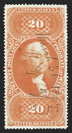 revenue stamp 2010 PF certificate.#R99c, $20.00 Probate of Will, exceedingly well centered within large margins, brilliant color, light 1864 ms. cancel, extremely fine; an uncommonly choice example of this scarce revenue stamp; 2010 PF certificate. (Image) $2,000.00