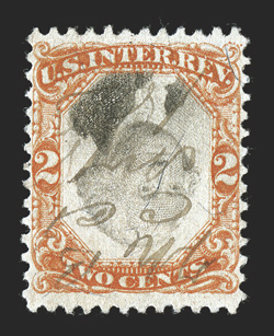 579 O R135b R135b, 2c Orange and black, Inverted Center, well centered, especially bright colors, light ms. cancel, very fine.#R135b, 2c Orange and black, Inverted Center, well centered, especially bright colors, light ms. cancel, very fine. (Image) $600.00