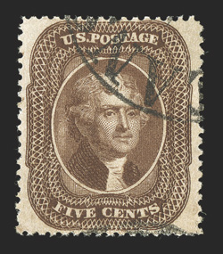 This unique showpiece multiple is clearly one of the most important pieces from the 1857-61 issue. Lester Brookman states its significance best in his The United States Postage Stamps of the 19th Century, Volume 1 where he says: "This stamp (#34) can be had in block form although as such it is of the greatest rarity. Perhaps the most remarkable of all the blocks of the perforate Ten Cent stamps is a block of 10 stamps that contains all of the major varieties of the perforated stamps from Plate 1....In this block are 2 Type I, 1 Type II, 2 Type III and 5 Type IV stamps. The Type IV stamps in the block have all three varieties of the recutting since they show stamps recut at top only, stamps recut at bottom only and a stamp recut at both top and bottom. This remarkable block happens to be pen-cancelled and as such might not find favor with condition cranks, but to the specialist who understands and appreciates an item of this nature, this block is a real treasure...and is almost unquestionably a unique item."