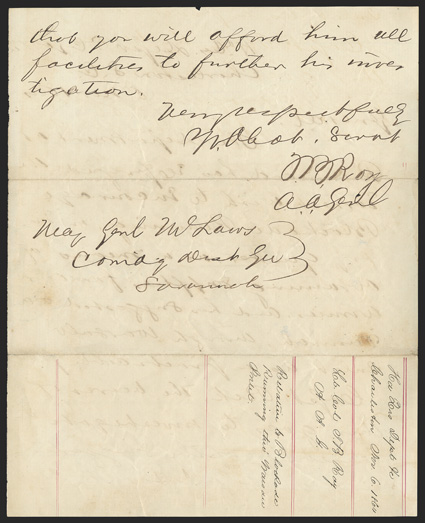 Lafayette McLaws, commander of the District of Georgia, that TheBlockade Runners: Savannah Important ALS by assistant adjutant general T.B. Ray, aide to Gen William Hardee, 1-2/3 pages, 4to, Charleston, SC, November 6, 1864. He writes to Gen Lafayette McLaws, commander of the District of Georgia, that "The Department at Richmond has expressed the earnest wish to encourage Blockade Running in every quarter as a means of obtaining Supplies for our armies, and has suggested Savannah, through Warsaw Inlet, as a practicable port. Capt. Peck the bearer of this, goes to investigate the feasibility of the suggestion and Lieut Genl Hardee begs that you will afford him all facilities..." Docketed on lower third of second page. Age-toned, with some fold wear, but boldly written and VG. It was too late to establish a new blockade-running route near Savannah. Just days after this letter, WT Sherman's troops were making their way across eastern Georgia and bearing down on the city, which McLaws and Hardee would be unable to defend. By Christmas, Savannah was in Union hands. (imagea) (Image) Est. $500-750