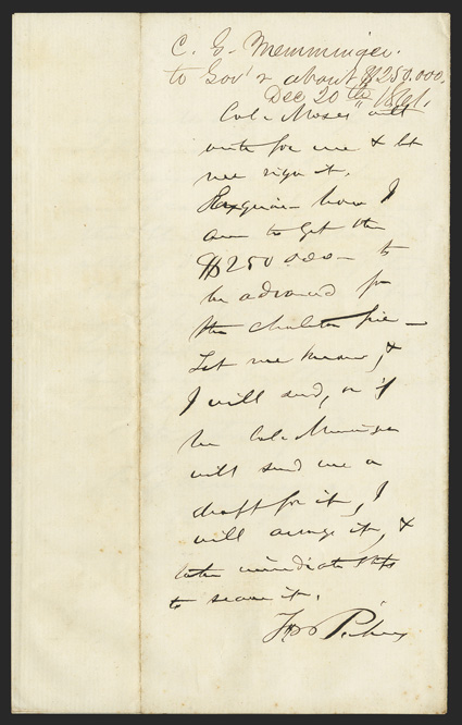 91   Charleston: CG Memminger and FW Pickens  Important Autograph Letter Signed C.G. Memminger, Secy of Treas., 2 pages, 8vo, Richmond, December 20, 1861. He writes to Gov. F.W.
