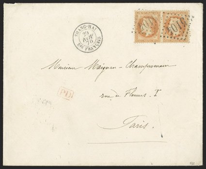 1 c   Image1870 Cover from Shanghai to Paris franked by horizontal pair 30c Pale orange on yellowish (Yvert #31) tied by two clear strikes of "5104" in lozenge, perfectly struck "Shang-hai/Bau Francais/28 Nov 70" datestamp alongside, red boxed "PD" and "Marseille A Lyon/Special/18 Janv 71" transit backstamp, fresh and extremely fine. (Image) Maury €550