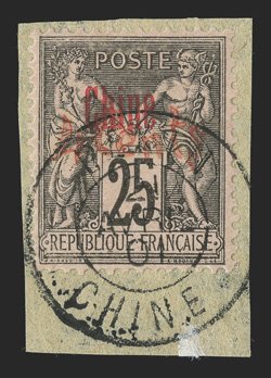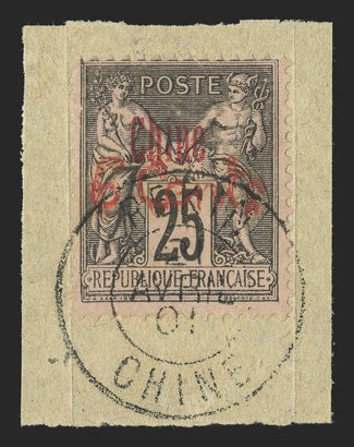 12 p Yvert #22A ImageYvert #22A, 1901 "16 Cents" Surcharge on 25c Black on rose, black surcharge, a very pleasing example of this Offices in China rarity, being tied to piece by clear 21 April 1901 Peking datestamp, fresh and very fine; one of a mere 50 stamps to have received the surcharge in black instead of red; signed Calves, Champion and Roumet (Scott #17a; $7,250.00). (Image) €8,000