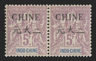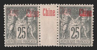 6 og Yvert #8c ImageYvert #8c, 1894 "Chine" Overprint on 25c Black on rose, double overprint, rare horizontal gutter pair of this error, both stamps with a light and a strong overprint impression, plus there is an additional overprint in the gutter, o.g., h.r. and hinge reinforced perforation separations, very fine; both signed Calves twice (Scott #6a; $450.00 for singles). (Image) for singles €600+