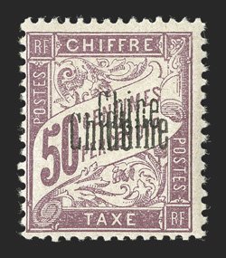 16 og Yvert #TT7 ImageYvert #TT7, 1903 "A/PERCEVOIR" Handstamp in carmine on 10c Black on lavender, an especially desirable mint example of this rarity, wonderfully fresh, o.g., very lightly hinged, fine; one of only a few surviving mint copies of this postage due; signed Roumet (Scott #J8; unpriced). (Image) €9,500