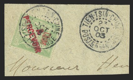 19 p Yvert #TT13 ImageYvert #TT13, 1903 "A/PERCEVOIR" Handstamp in carmine on 5c Green on greenish, well centered, tied to piece by 23 Oct. 1903 Tientsin postmark which is repeated at right, fresh and very fine (Scott #J20b; unpriced). (Image) €370