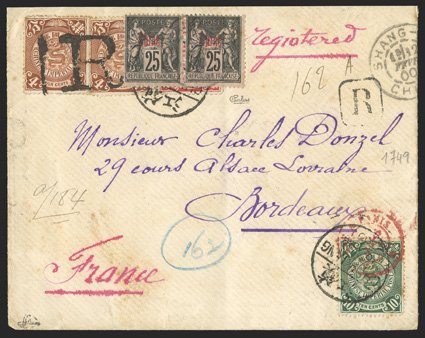 2 c Yvert #8 Image1900 Registered combination cover from Shanghai to France, franked with China 2c, 4c pair and 10c CIP Coiling Dragons (Scott #100, 101, 103) tied by two strikes of Shanghai 12 Feb. 1900 bisected bilingual dater and large "I R" chop to registered cover to Bordeaux, entered the French mails with horizontal pair 25c Black on rose (Yvert #8) tied by light datestamp which is repeated at top right, boxed "R" handstamp and red Paris transit additionally tying the 10c Coiling Dragon, cover with handsome Chinese seal or reverse, light vertical pocket fold slightly affecting on 25c stamp, otherwise a very fine and attractive usage; signed J-F Brun and Calves. (Image) Est. $750-1,000